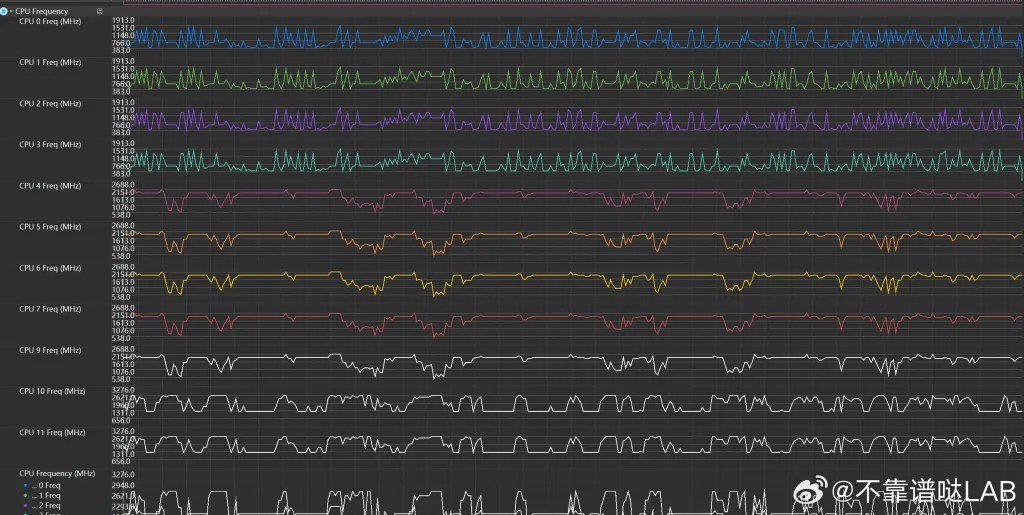 Our GeekBench5 testing in performance mode showed that all 12 threads can operate at their top frequencies without experiencing core locking or frequency occupancy problems. It’s important to note that our observations were limited to CPU 0-7 due to benchmarking software restrictions.