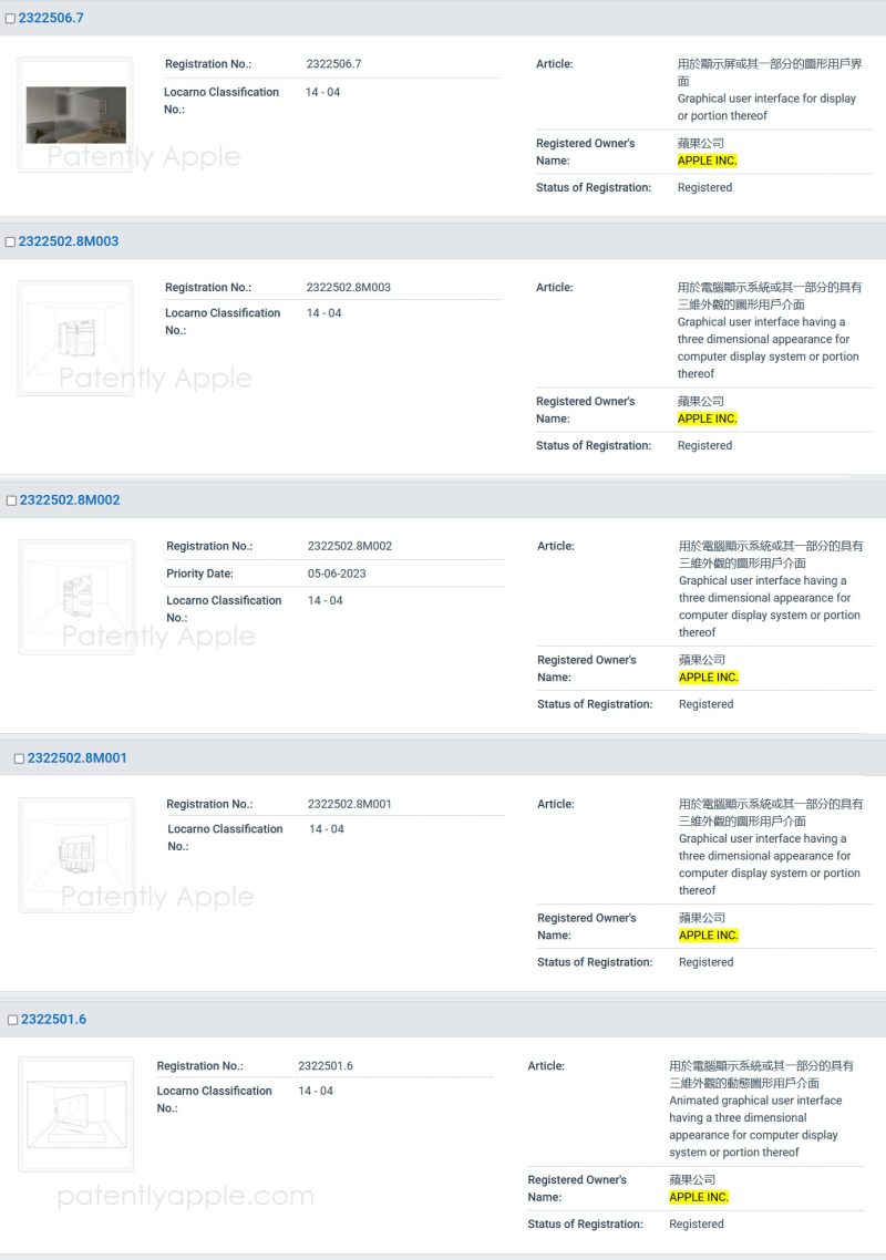 Apple got five additional design patents related to visionOS on Friday, as confirmed by the Hong Kong Patent and Trademark Office. The title reads: “Graphical User Interface having a three-dimensional appearance for computer display system of portion thereof.” “Screen Displays and Icons” is the category under which all five works were filed under Locarno Classification 14-04. That class includes #102429, which is titled “Graphical User Interfaces (computer screen layouts).”